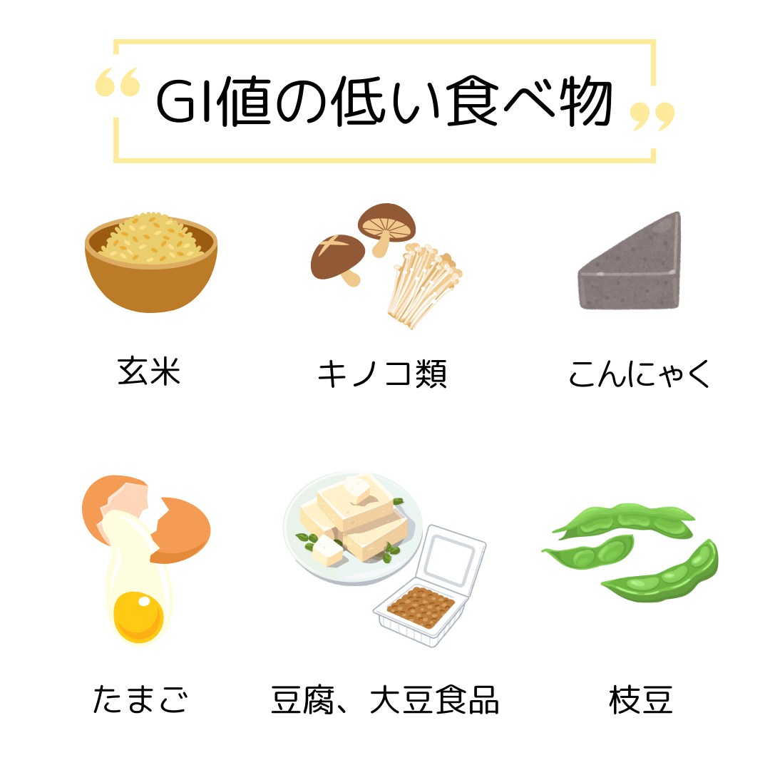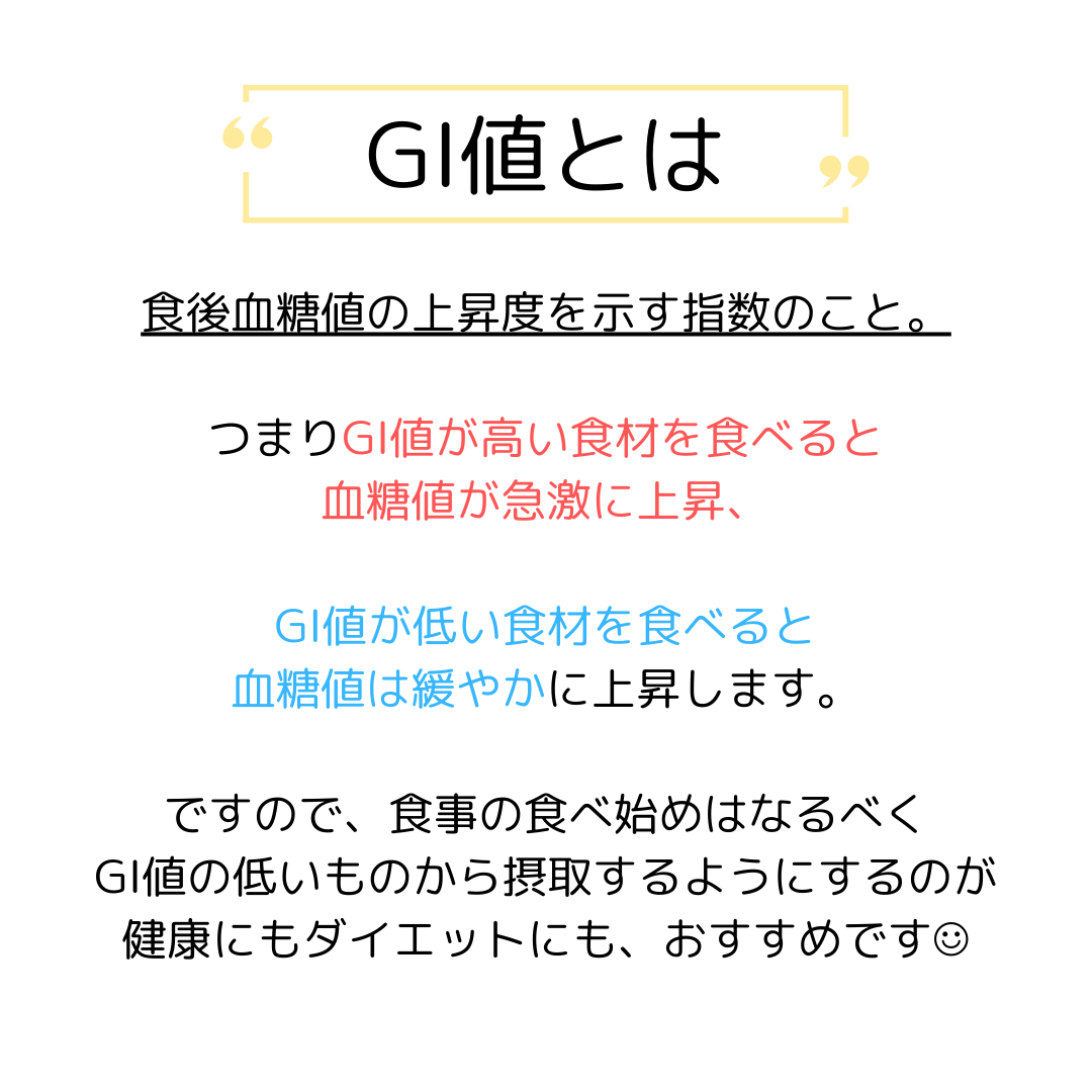 GI値とは、食後の血糖値がどれくらい上がりやすいかを示す数値。